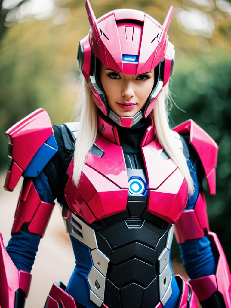 Photo-realistic cosplay photo of person in arcee costume. 1girl, blue eyes, medium breasts, autobot, robot girl, mechalifestyle stock photo, shallow depth of field, lifestyle stock photography, shallow depth of field, natural lighting, warm tones, soft background blur, candid moments, vibrant colors, realistic textures, modern casual clothing. full body shot