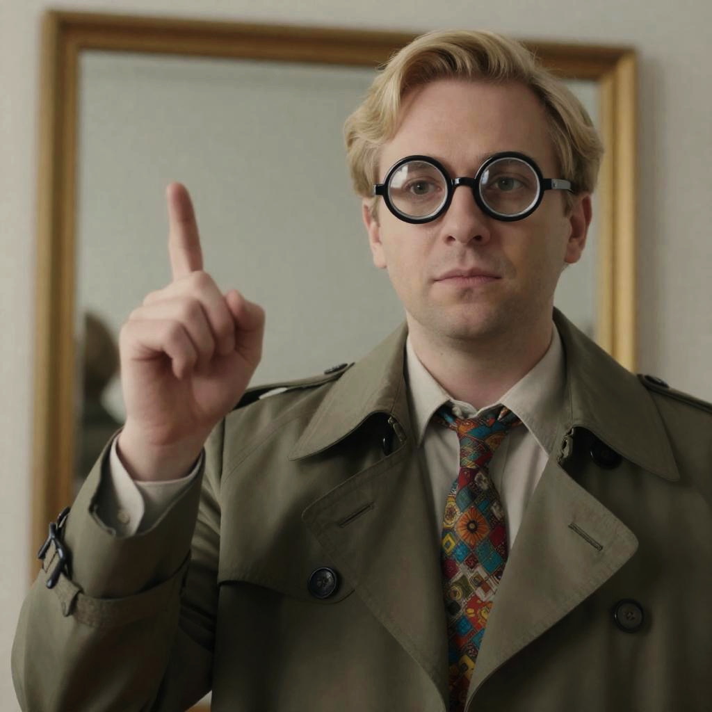 Photograph of a blonde man with large, black round glasses, pointing upward with his right index finger. He wears a green trench coat over a colorful patterned tie and a light-colored shirt. Background includes a framed mirror with a wooden border. His facial expression is neutral.