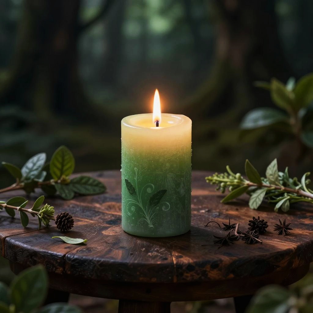 Green flame candle glowing brightly on an ancient wooden table, surrounded by mystical herbs and soft candlelight shadows, enchanted forest background, detailed and atmospheric