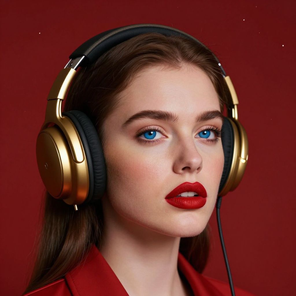 Against a starlit crimson backdrop, a woman adorned with oversized golden headphones exudes a dreamlike aura, her vibrant red lips and piercing blue eyes inviting the viewer into a surreal auditory realm.