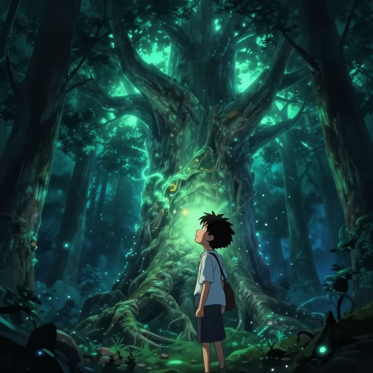 Anime boy looking up at a giant ancient tree glowing with mystical energy in a dark forest, magical particles swirling around him, his expression a mix of awe and determination, fantasy anime style with intricate environmental details.