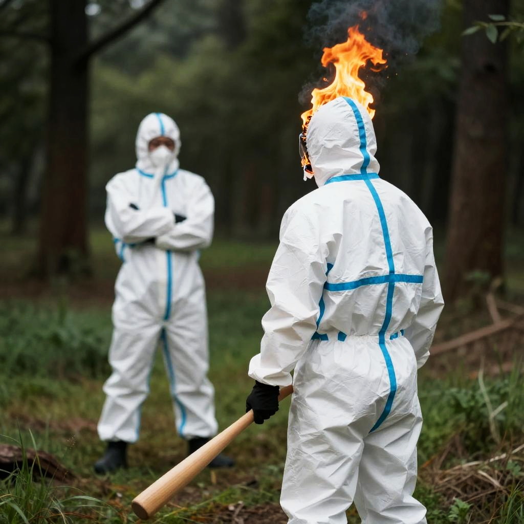 Photograph of a forest clearing. Two people in white hazmat suits. Foreground: person with head and back on fire, holding a wooden bat, facing away. Background: person standing, arms crossed, facing the flaming person. Grass and trees surround them.
