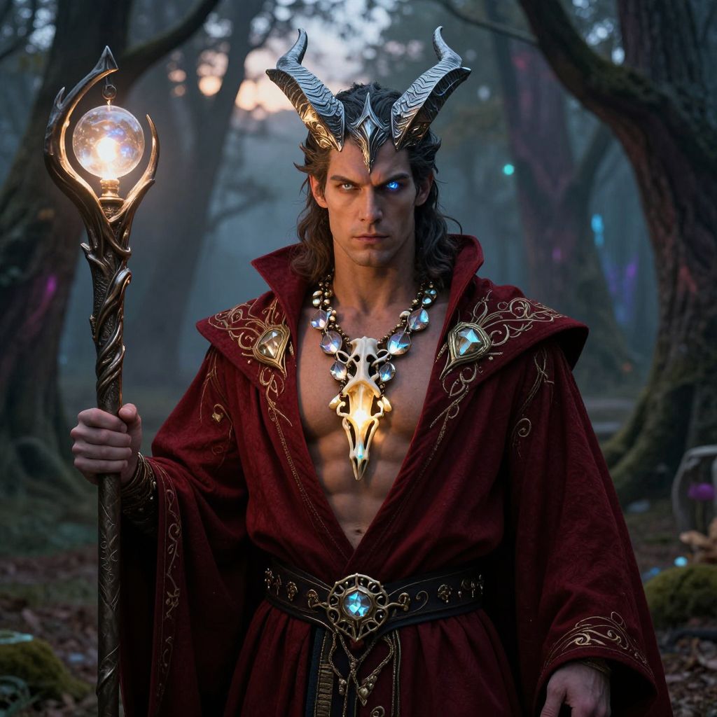 A strong, muscular man with intricate silver horns growing from his head, glowing faintly with a soft blue light, standing in a mystical forest at twilight. He wears a flowing, deep-red cloak with golden embroidery, and a ornate, ancient-looking necklace made of intertwined crystals and bone around his neck, which pulses gently with a warm inner glow. His eyes are sharp and wise, reflecting the fading sunlight, and he carries a staff topped with a glowing orb. The scene is rich in detail, with enchanted trees, misty air, and a sense of quiet power and mystery.