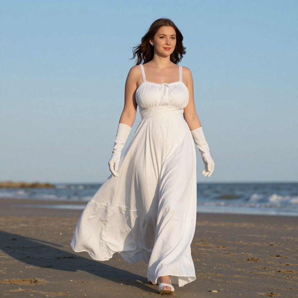 Photograph of a young woman with fair skin and dark, wavy hair walking on a sandy beach under a clear blue sky. She wears a flowing, white, sleeveless dress with thin straps and a fitted bodice, paired with white, elbow-length gloves. Her dress billows slightly, and she wears brown sandals. The ocean is visible in the background, with gentle waves and a distant shoreline on the left. The sand is dark and textured, adding contrast to her bright outfit. The sunlight casts subtle shadows, enhancing the serene beach setting.