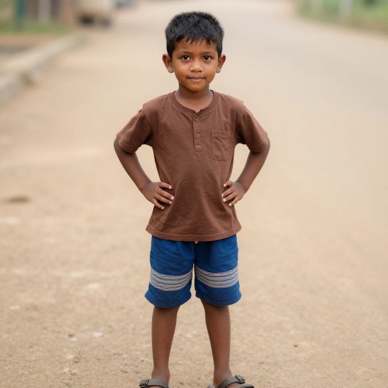 Boy in Brown Shirt and Blue Shorts