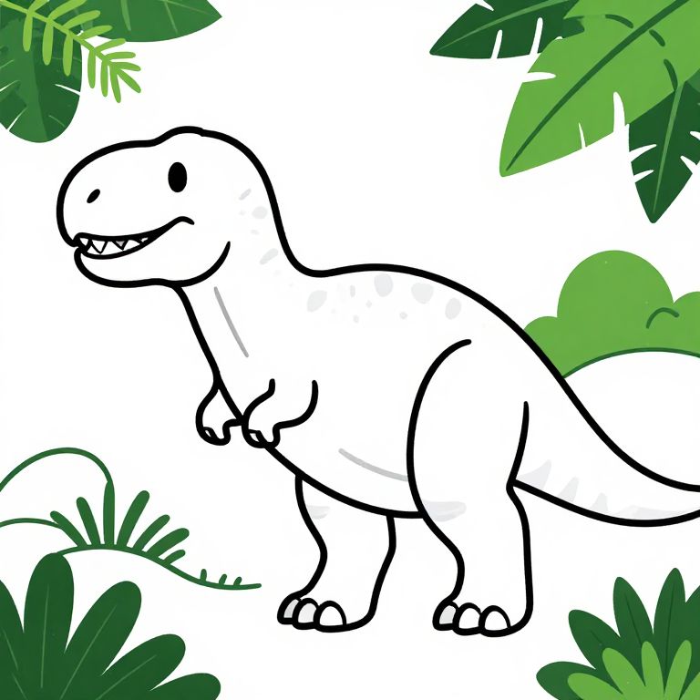 Camel Hair colouring page for kids, tyrannosaurus rex in a jungle, cartoon style, anatomically correct, thick lines, low detail, no shading,