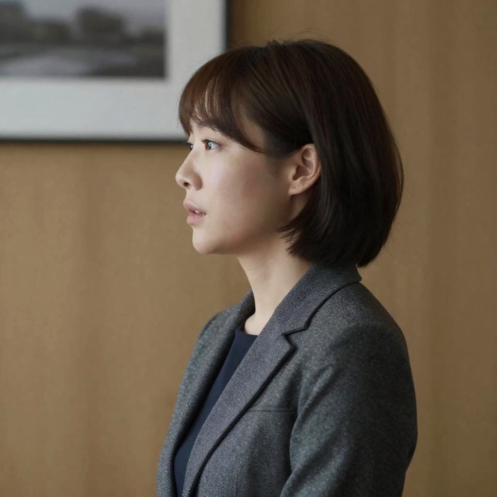 Photograph of a woman with shoulder-length brown hair, wearing a beige knitted sweater, sitting in profile, holding a small object. Behind her, a table with a decorative lamp, snowman figurine, and framed photos. Another woman with short brown hair, in profile, sits to the right. Red curtain in the background.