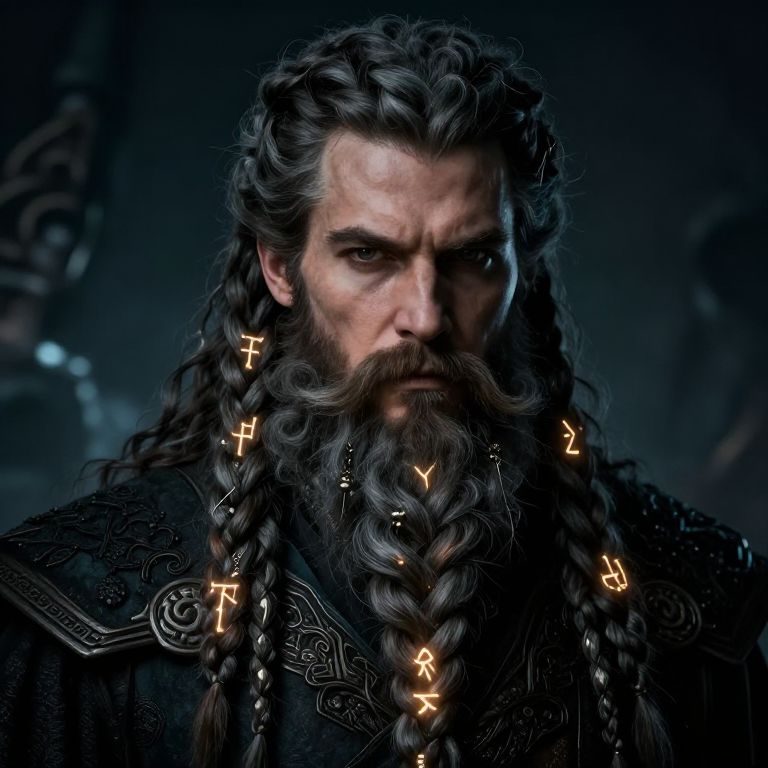 Photorealistic digital artwork of a stern, middle-aged man with long, thick, wavy black hair and a full, braided beard adorned with glowing, gold runes. His dark, intense eyes contrast with his pale skin. He wears an elaborate, black, ornate robe with intricate patterns on the shoulders. The background is a blurred, dark blue, suggesting a mystical or medieval setting. The lighting highlights the runes and the texture of his hair and beard. His expression is serious and commanding, evoking a sense of power and ancient wisdom.
