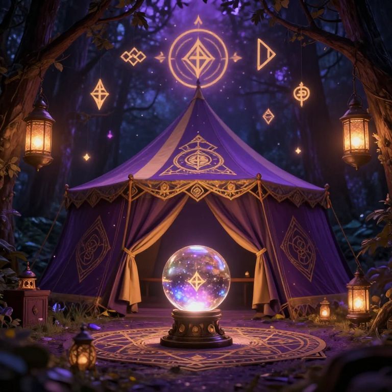 Furtune, a mystical scene with an ancient fortune teller's tent illuminated by glowing lanterns, mysterious symbols floating in the air, rich purple and gold tones, intricate patterns, a crystal ball radiating magical light in a dark enchanted forest.