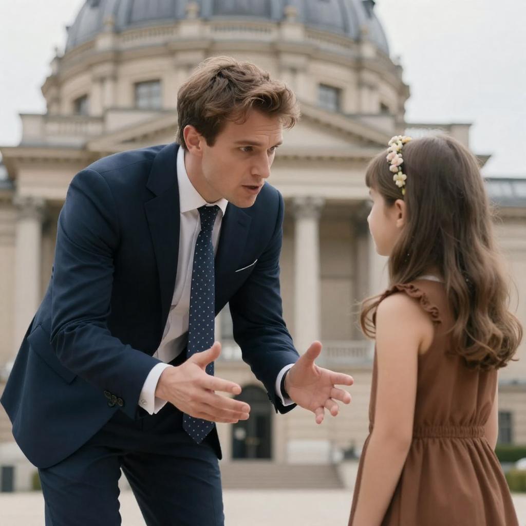 Photograph of a man in a dark blue suit and polka dot tie, leaning forward, gesturing with hands. A young girl with long brown hair, wearing a floral headband and brown dress, stands facing him. Classical building with dome in background. Man's expression is intense, girl's expression is neutral. Both focus on each other.