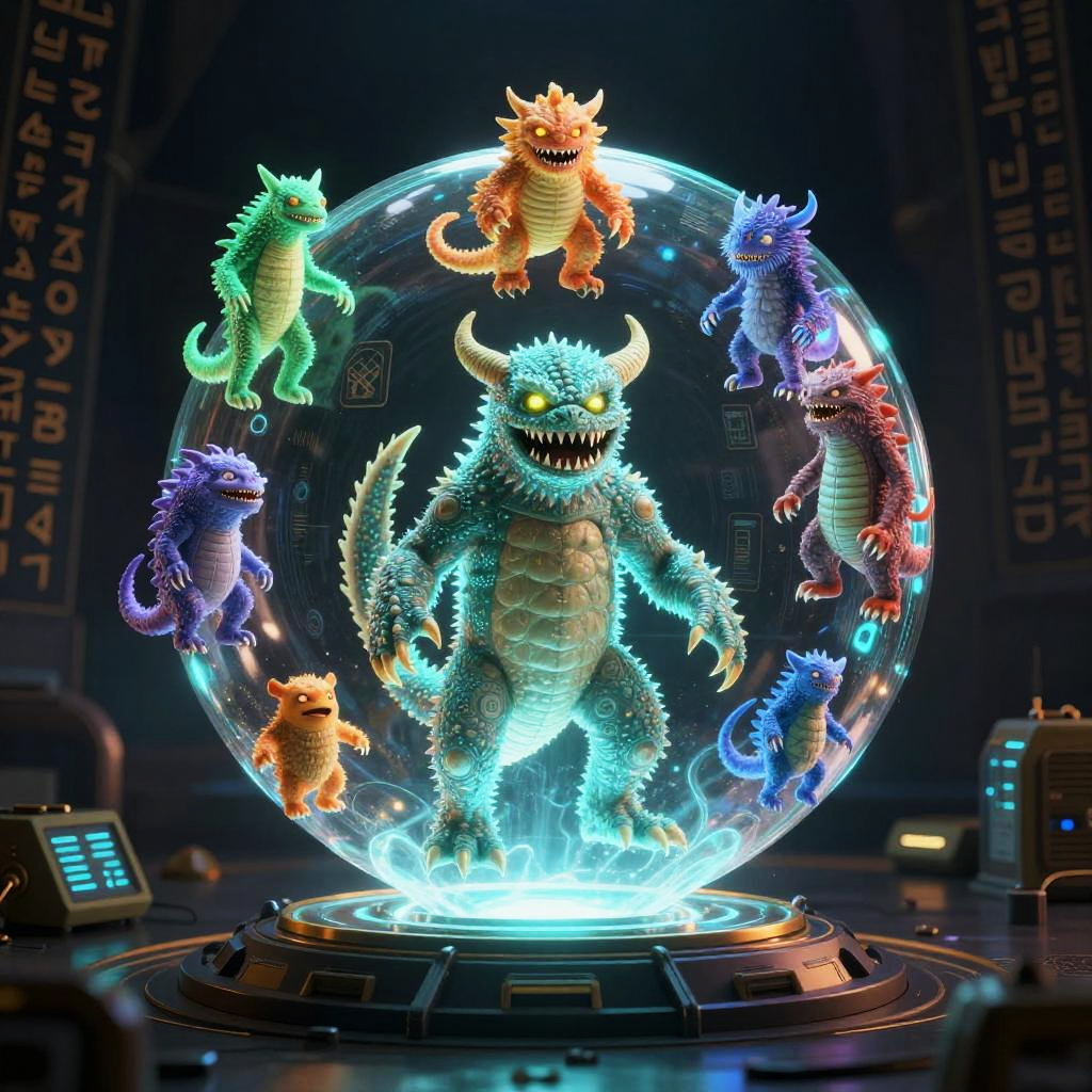 Futuristic monster image generator depicted as a glowing orb projecting holographic monsters of all shapes and sizes, floating in a dark room filled with ancient runes and futuristic technology, blending fantasy and sci-fi styles.