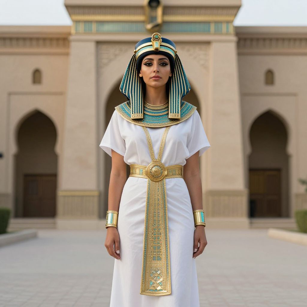 Photograph of a woman in an Egyptian pharaoh-style headdress and white dress with gold and turquoise accents, standing in front of a stone building with