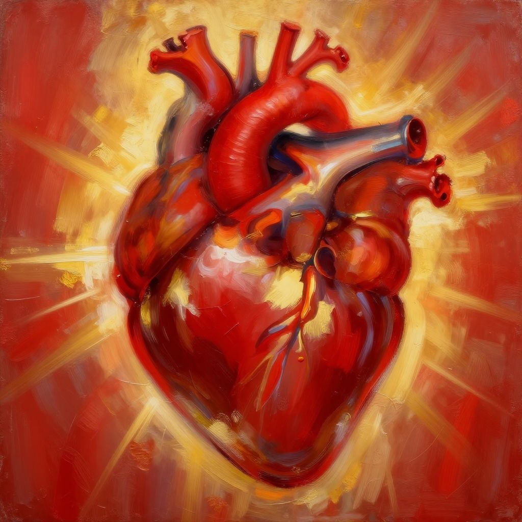 Abstract heart painting displaying radiant light effects, smooth and rough textures combined, intense red and gold palette, expressive brushwork evoking warmth and connection