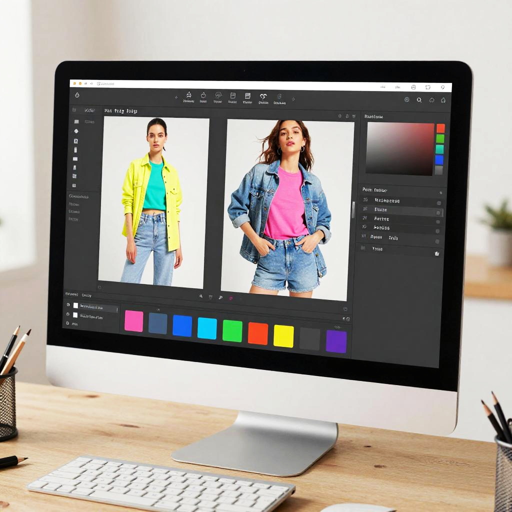 Photo clothing editor interface on a sleek modern computer screen, with vibrant clothes being digitally adjusted, stylish UI elements, bright workspace background, creative professional setting, high resolution, vivid colors, dynamic composition
