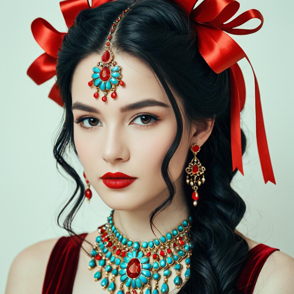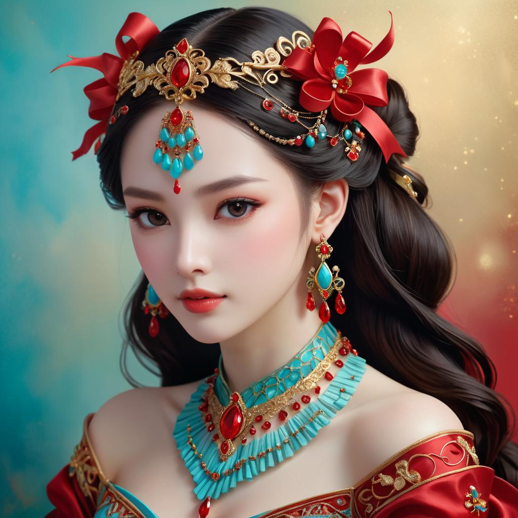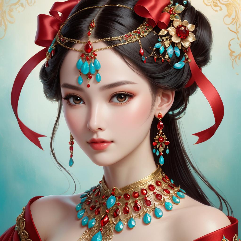 A highly detailed portrait of a young woman with porcelain smooth skin and delicate facial features, styled in fantasy realism. She has dark hair intricately arranged with elegant hair ornaments and flowing red ribbons. She wears elaborate jewelry with red and turquoise gems, set against a soft, light background with warm gold and red color accents, soft natural lighting highlighting the textures and details.