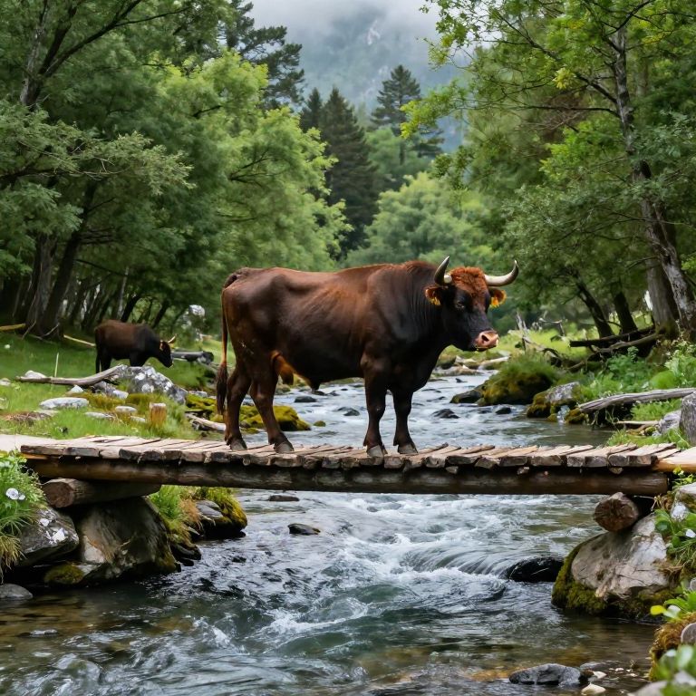 Photograph of a lush forest scene with a brown bull with curved horns standing on a wooden bridge over a flowing stream. The bull faces right, displaying a muscular build and dark brown coat. Surrounding the bridge are green trees, moss-covered rocks, and a clear, babbling stream with white water. In the background, more trees and a misty, mountainous horizon are visible, adding depth to the serene, natural environment. The lighting is soft, emphasizing the vibrant greens and the bull's rich brown color.