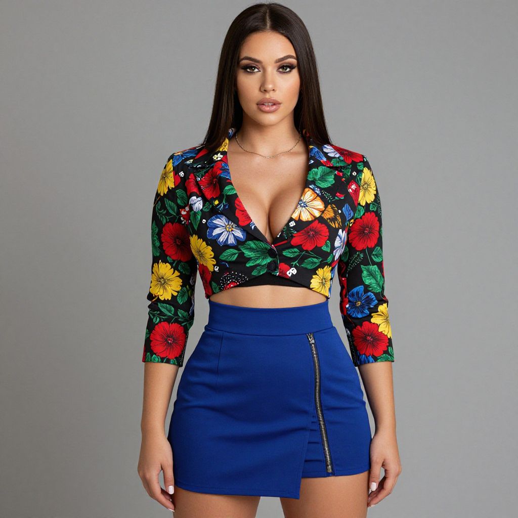 "Woman, funky, black cropped blazer with bold floral print, colors in red, green, and yellow tones, three-quarter sleeves, lapel collar, paired with a royal blue mini skirt, high-waisted, asymmetrical hemline, visible zipper, midriff-baring black top underneath, delicate gold necklace, straight hairstyle.. Sexy. Pretty face and beаutiful eyes. Big breasts."