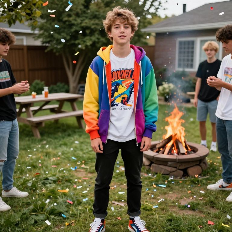 A natural-looking shot of a teenage boy dressed in a flashy teenage party outfit featuring a rainbow hoodie, bold graphic tee, and bright sneakers, standing in a backyard with friends, his face has a casual, relaxed expression with a slightly messy hairstyle and freckles, the background includes a garden with picnic tables, a bonfire, and confetti falling in the air.