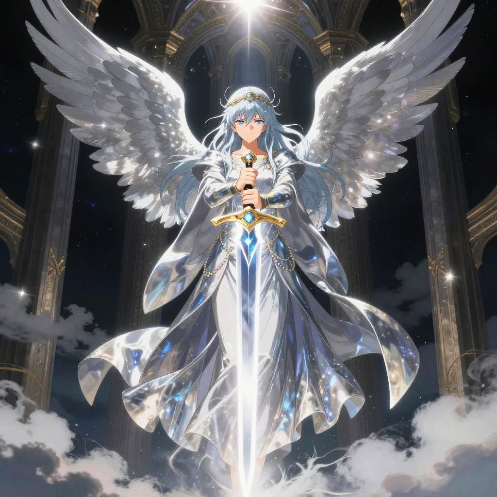 A celestial guardian angel, wearing flowing shimmering silver robes with ethereal glow, wielding a radiant sword engulfed in heavenly light, in a floating shining citadel above the clouds, drawn in the dark and stylish anime style of Kouta Hirano.