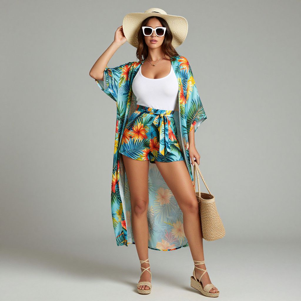 Full body shot, Petite woman, flowing resort wear kimono dress, lightweight silk fabric, vibrant tropical print, wide sleeves, cinched waist with a delicate sash, knee-length hem, open front design, layered over a fitted white tank top, matching high-waisted shorts, strappy espadrille sandals, oversized sun hat, statement sunglasses, woven beach tote, delicate gold jewelry, relaxed summer vibe Sexy. Pretty face and beаutiful eyes. Big breasts