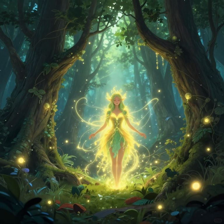 A digital fantasy illustration depicts a radiant, glowing fairy standing in a mystical forest. The fairy, with a golden, ethereal aura, has delicate, translucent wings and a crown of light. She wears a green, leaf-like dress and stands at the center of a glowing circle on a forest floor covered in lush foliage and small fireflies. Tall, dark trees frame the background, illuminated by soft, blue-green light filtering through the dense canopy. The fairy's serene expression and the gentle, magical atmosphere create a sense of enchantment and wonder.