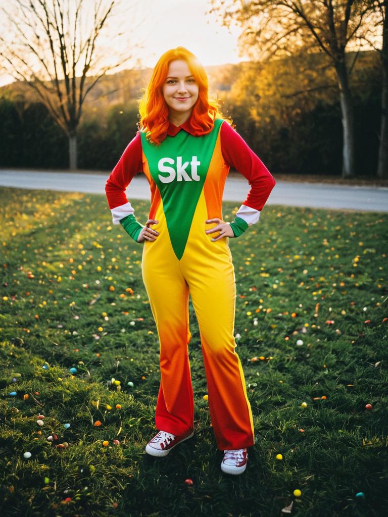 Person in Skittles Costume, outdoor golden hour cosplay photo