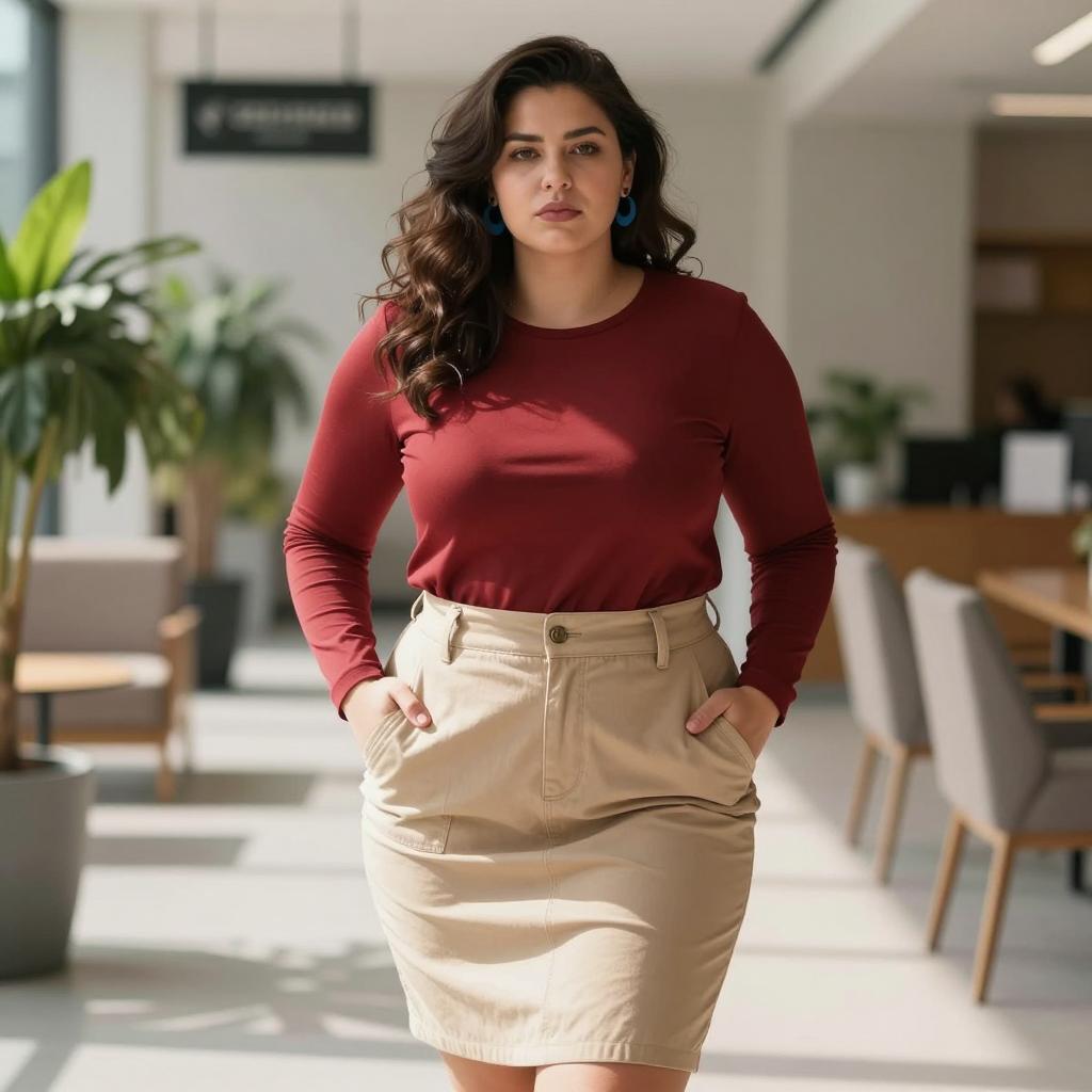 Plus size skirts, photorealistic, female, standing, center frame, medium shot, dark brown wavy hair, red long-sleeve shirt, beige high-waisted skirt with front pockets, hands in pockets, blue earrings, serious expression, indoor setting, sunlight, blurred background, modern office or waiting area, plants, chairs, signage in background, daytime, casual attire, confident, medium build