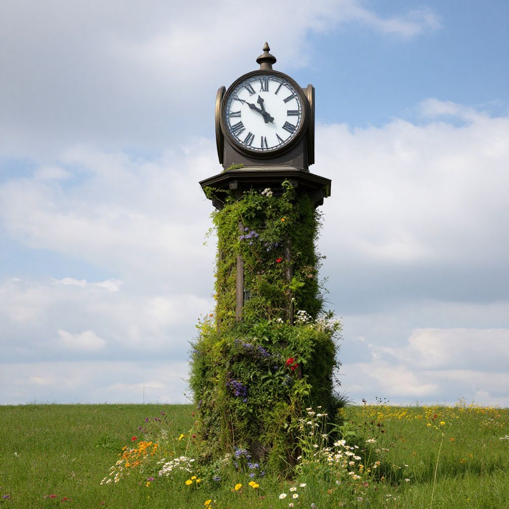 A vintage clock tower stands majestically amidst a vibrant field, its face adorned with Roman numerals and black hands, while lush greenery and colorful wildflowers cascade down its structure, creating a harmonious blend of nature and time against a serene sky dotted with clouds.
