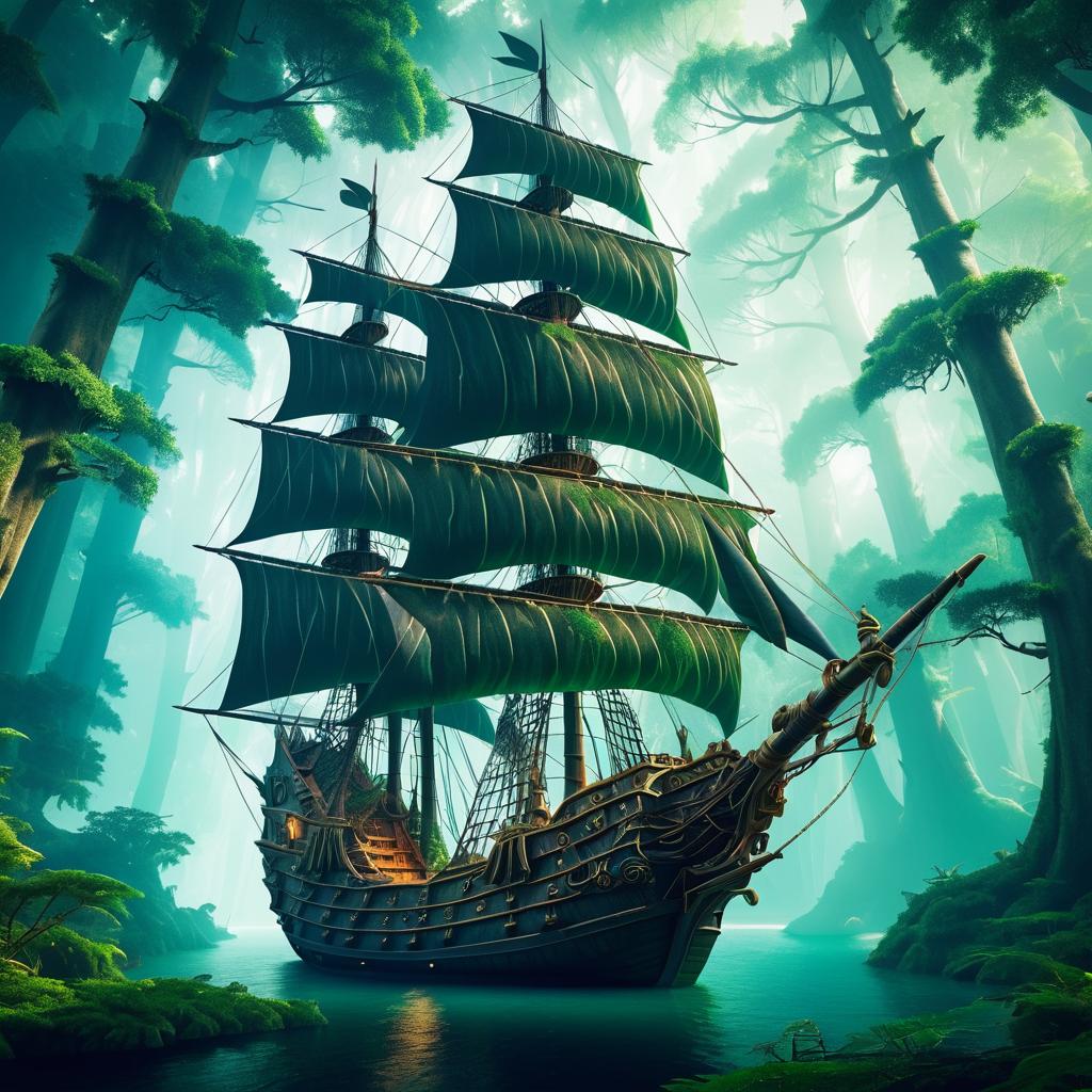 Pirate ship sailing through a mystical forest with giant trees and glowing fairies. Ultra-detailed concept art, trending on ArtStation, HD quality.