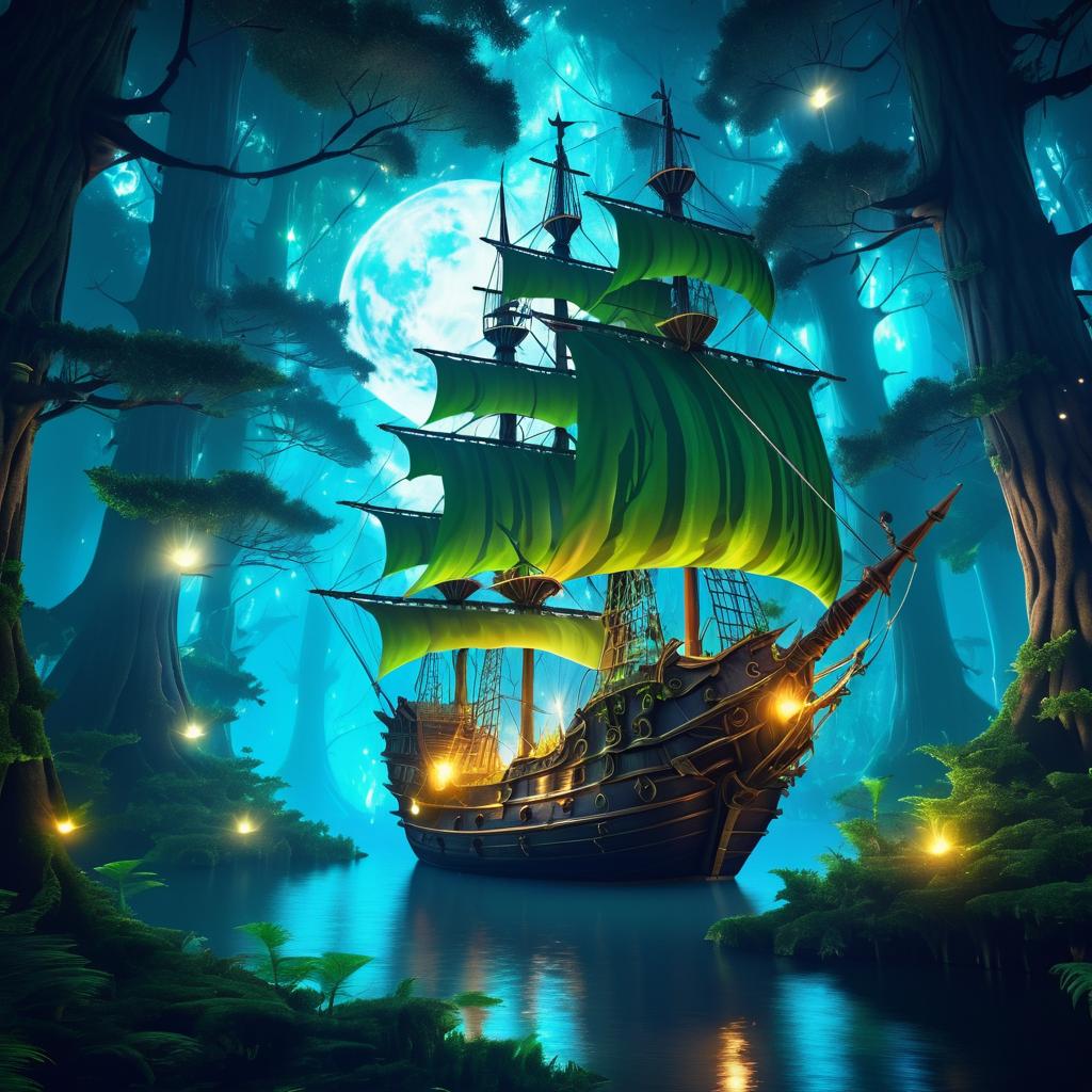 Ultra-detailed concept art of a pirate ship with vibrant green sails sailing through a mystical forest with giant trees and glowing fairies. The scene is illuminated by a large full moon and ethereal blue light, creating a magical and serene atmosphere.