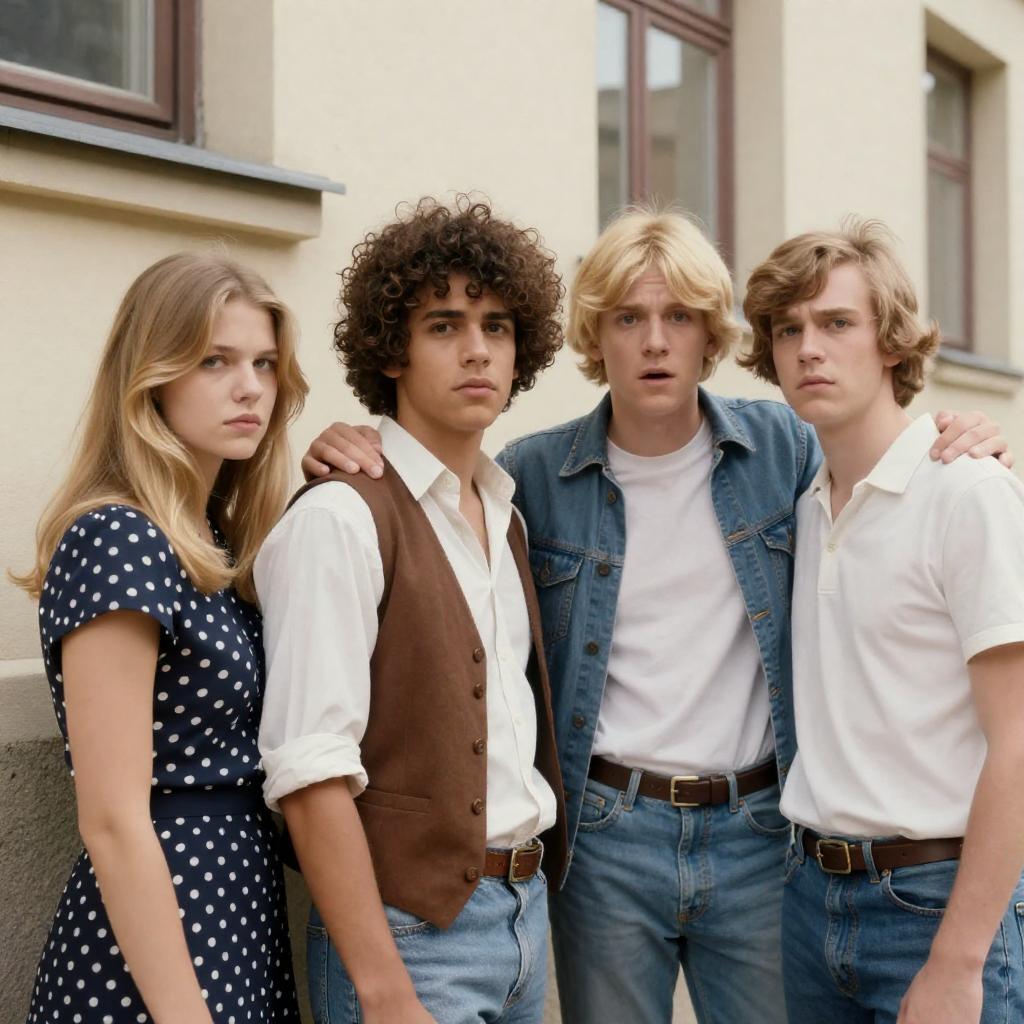 Three men crouched in a dimly lit room. Foreground man with long brown hair, white t-shirt, intense gaze. Middle man with curly brown hair, white shirt, surprised expression. Background man with black hair, yellow plaid shirt, mustache, focused expression. All lean forward, dark shadows.