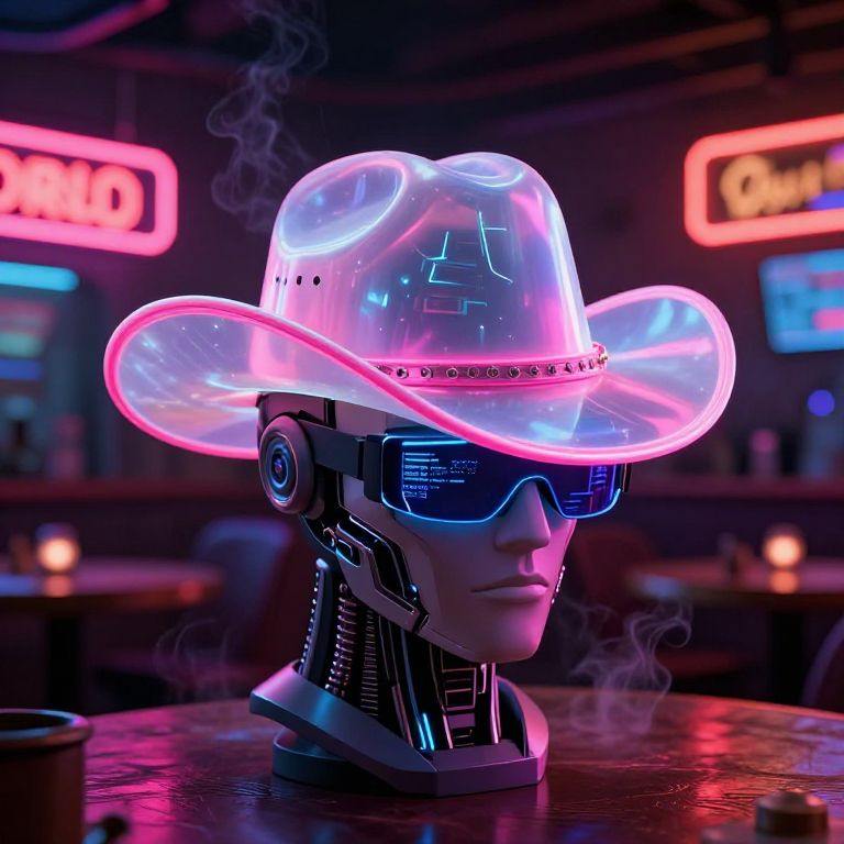 Cyberpunk cowboy hat made of translucent glowing material with neon pink trims, resting on a futuristic bust wearing augmented reality glasses in an underground cybernetic saloon, filled with neon signs, steam, and digital wild west motifs, blending traditional western cowboy elements with sci-fi tech.