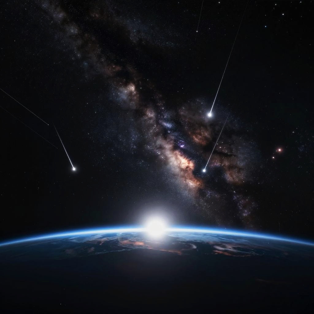 Deep space stars shining brightly over an alien planet's horizon, glowing meteor showers streaking through the night sky, ethereal cosmic dust illuminated by starlight, sharp contrast between the darkness of space and radiant stars, cinematic and immersive atmosphere