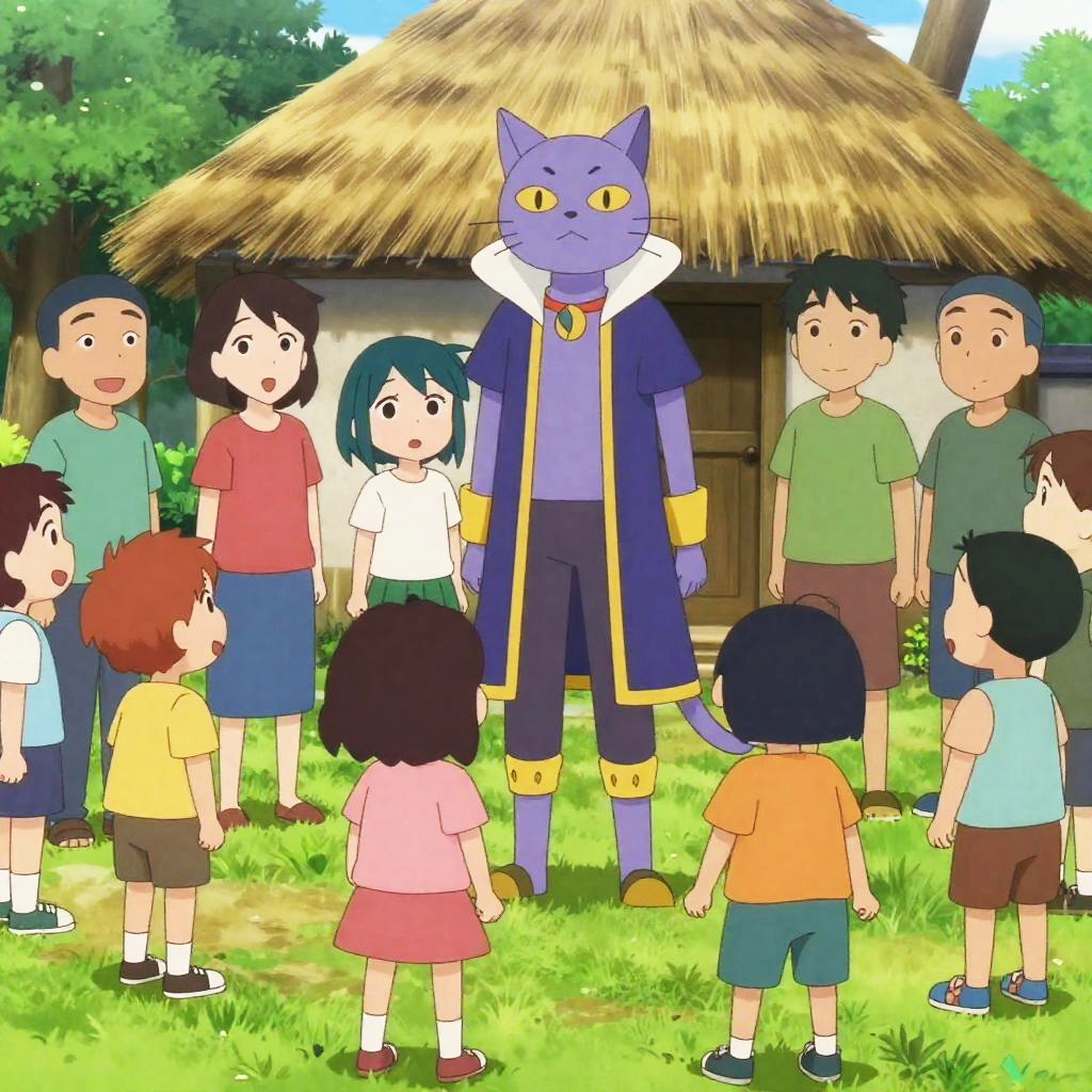 Anime-style drawing of a group of people gathered around a tall, anthropomorphic purple cat-like character in a regal outfit. The character stands confidently in the center, with a blue-haired girl beside him. Multiple children and adults in various colorful clothes surround them. A thatched-roof hut is in the background. The children are in the foreground, looking up at the central character. Several characters are seen from behind on the right. The scene is outdoors with green grass and trees.