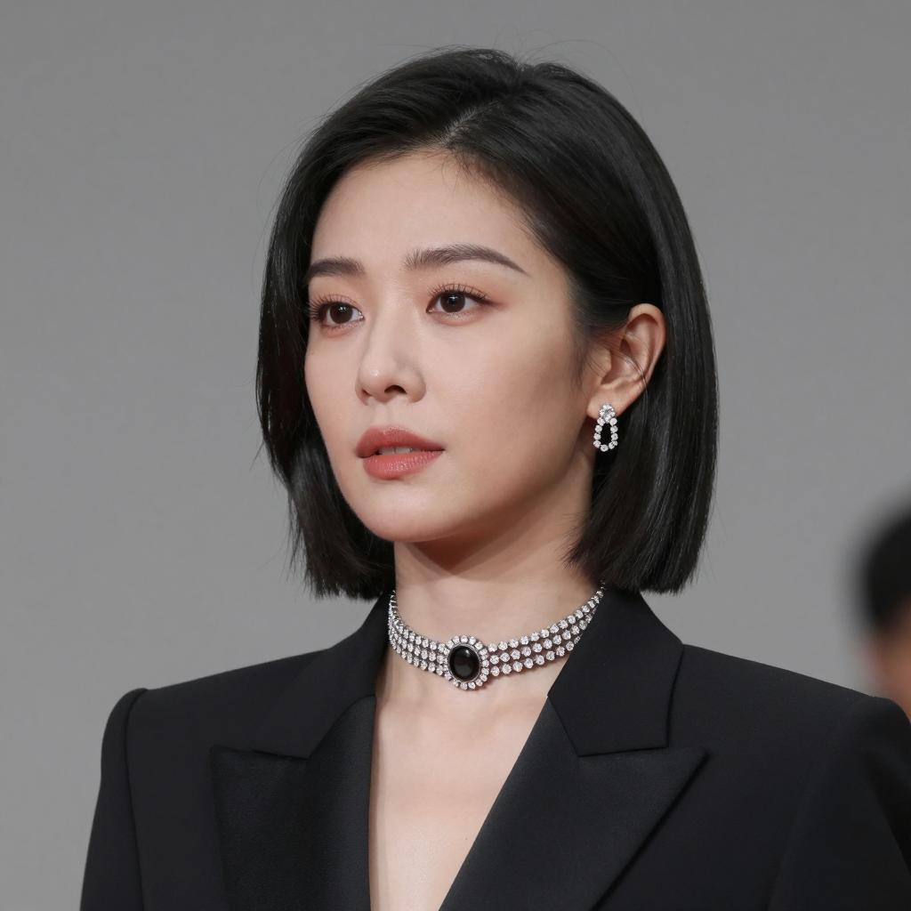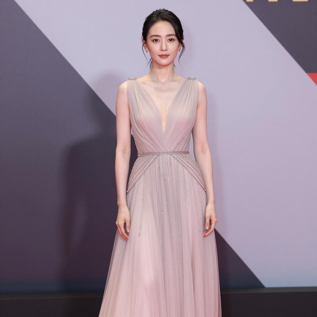 Portrait of an elegant Asian woman standing poised in a light pink sleeveless evening gown embellished with intricate beadwork. She has black hair styled in a neat updo and wears subtle makeup. The background features a modern geometric architectural design with shades of gray and lilac, enhancing the sophisticated and graceful atmosphere.