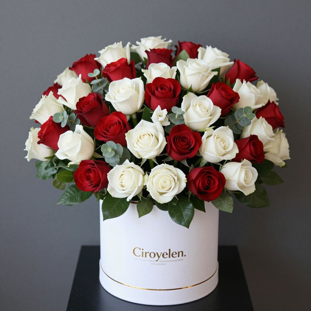 Elegant arrangement of vibrant red and pristine white roses, complemented by lush green foliage, gracefully displayed in a sophisticated white hat box adorned with gold detailing and the brand name \"Ciroylen.\