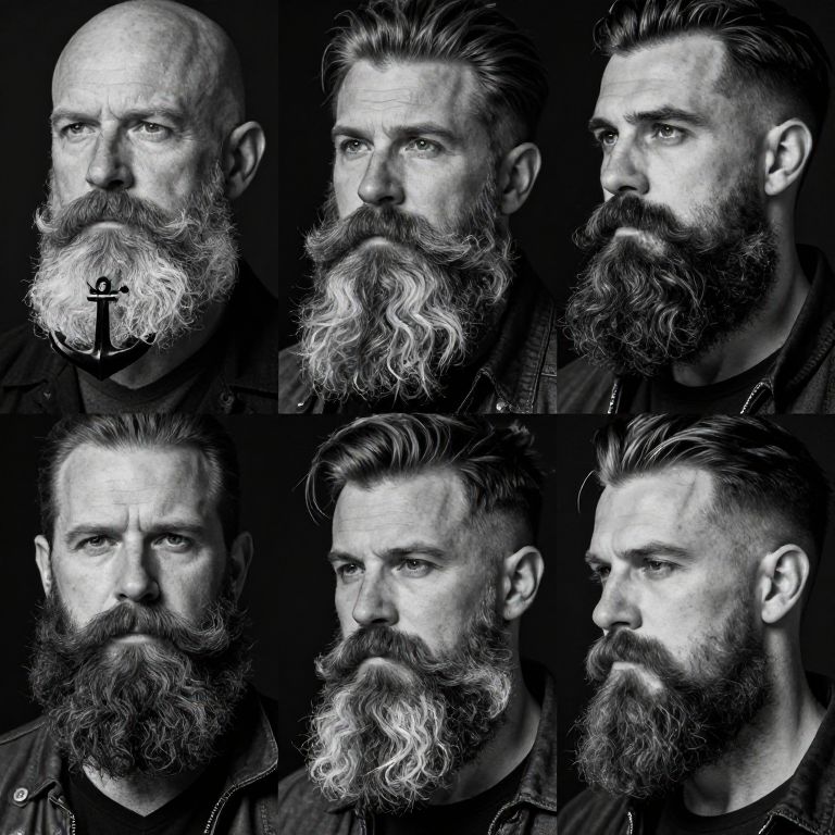 Styles of beards photos focusing on artistic close-ups of different beard styles like anchor, bandholz, and ducktail, enhanced with dramatic lighting and high contrast to emphasize hair texture and facial features in monochrome.