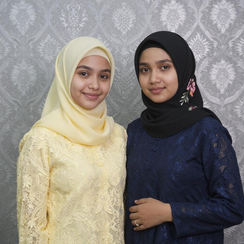 Photograph of two young women standing close together. The woman on the left wears a yellow lace hijab and top, smiling slightly, while the woman on the right wears a black floral hijab and a navy lace top, with her hand resting on the other's waist. The background is a ured, silver-gray pattern.