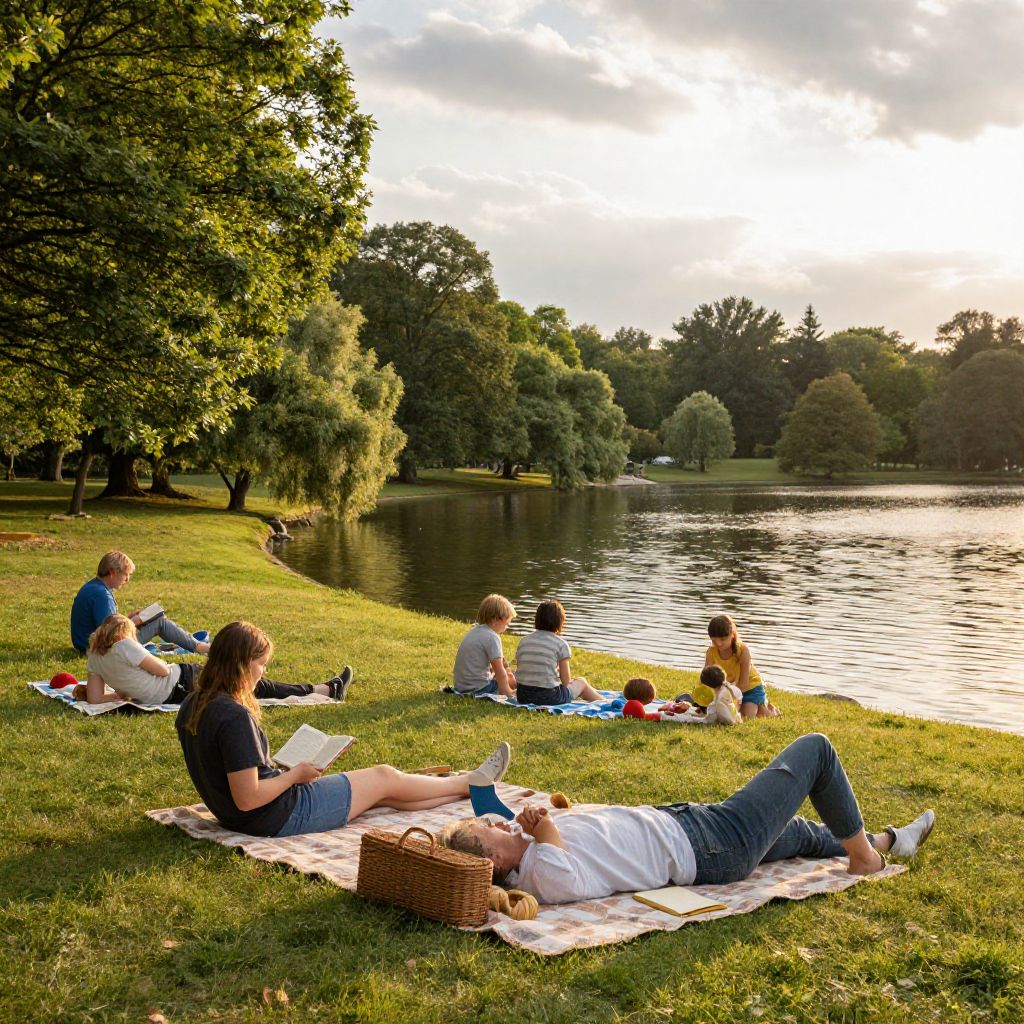 Leisure scene in a serene lakeside park during golden hour, with people lounging on picnic blankets, reading books, and children playing near calm water, surrounded by lush trees and soft sunlight filtering through clouds, evoking peace and relaxation.