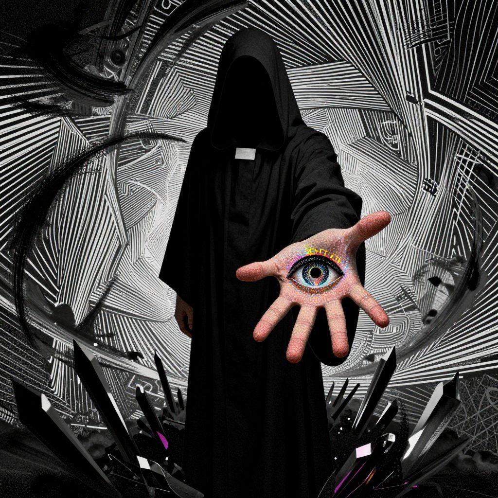 A highly stylized digital artwork blending modern art, surrealism, minimalism, and pointillism, portraying a faceless priest cloaked in a flowing black hooded robe, standing in a shadowy, enigmatic setting, From a dramatic 45-degree top view, the focus falls on his outstretched right hand, palm open and stretched toward the viewer, with fingers splayed as though channeling an otherworldly force, Embedded in his palm is a surreal human eye, intricately detailed with pointillist patterns of iridescent dots and neon lines in vivid shades of black, red, yellow, and blue, faintly glowing with an eerie allure, The background features a mesmerizing optical illusion of sharp, non-linear black and white lines, creating a fragmented yet fluid motion that avoids spirals or circular motifs, Interspersed are elements of Japanese ink art, with bold, sweeping brushstrokes adding depth, while minimalist typography weaves cryptic symbols subtly into the composition, The sharp black crystal spikes beneath him pierce the ground, catching faint neon reflections in their jagged surfaces, The interplay of dramatic lighting and soft pointillist textures enhances the surreal and unsettling atmosphere, crafting a visually compelling fusion of minimalism and intricate artistic detail
