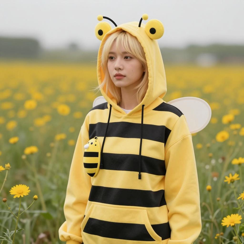 Adult jumpsuit costume, photograph of a person standing outdoors, wearing a white hoodie with a unicorn hood, pink unicorn ears, and a pink unicorn horn, neutral expression, hands in hoodie pockets, background blurred building, daytime, sunny, realistic style, candid, casual clothing, whimsical, playful, soft ures, unicorn costume, frontal view