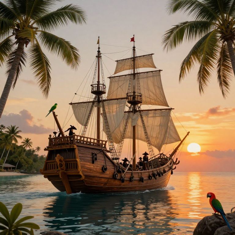 Photograph of a wooden pirate ship with billowing sails at sunset, surrounded by palm trees, and a colorful parrot perched on a rock in