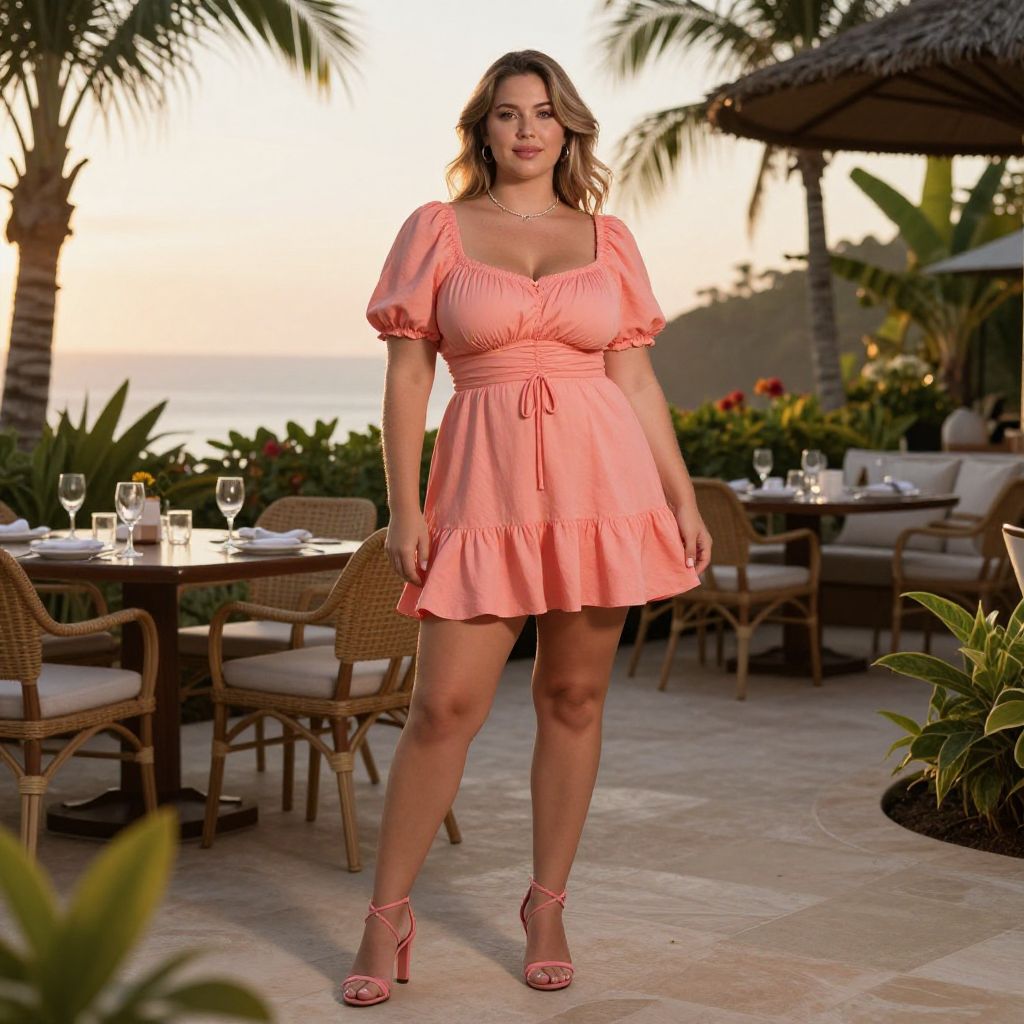 Photograph of a curvy woman with light brown skin, shoulder-length wavy brown hair, and full lips, standing outdoors at sunset. She wears a peach-colored, short-sleeve, V-neck dress with ruffled details and a cinched waist, accentuating her ample cleavage and hourglass figure. She also wears pink strappy high-heeled sandals. The background features a tropical setting with palm trees, a thatched-roof pavilion, and outdoor tables with wicker chairs, set for dinner with glassware and white napkins. The sky is a gradient of orange and pink, and the ocean is visible in the distance.