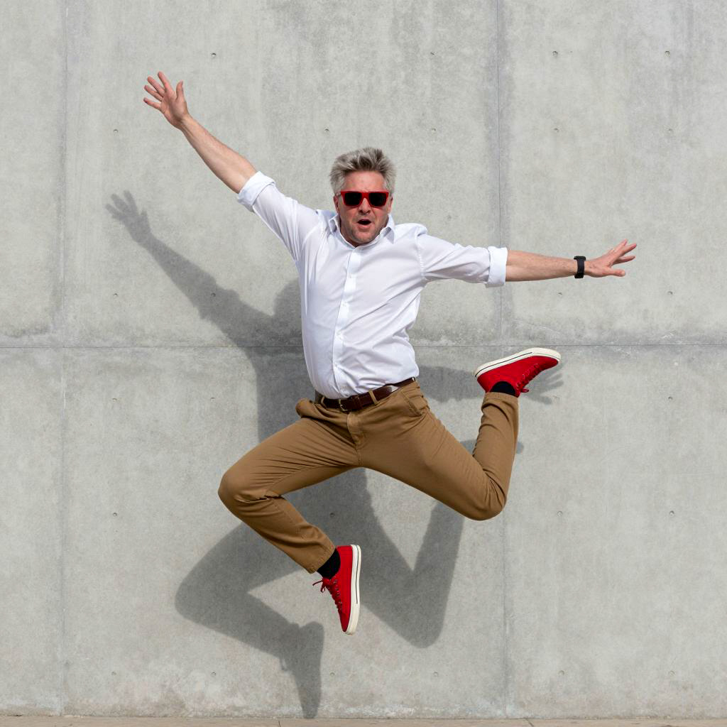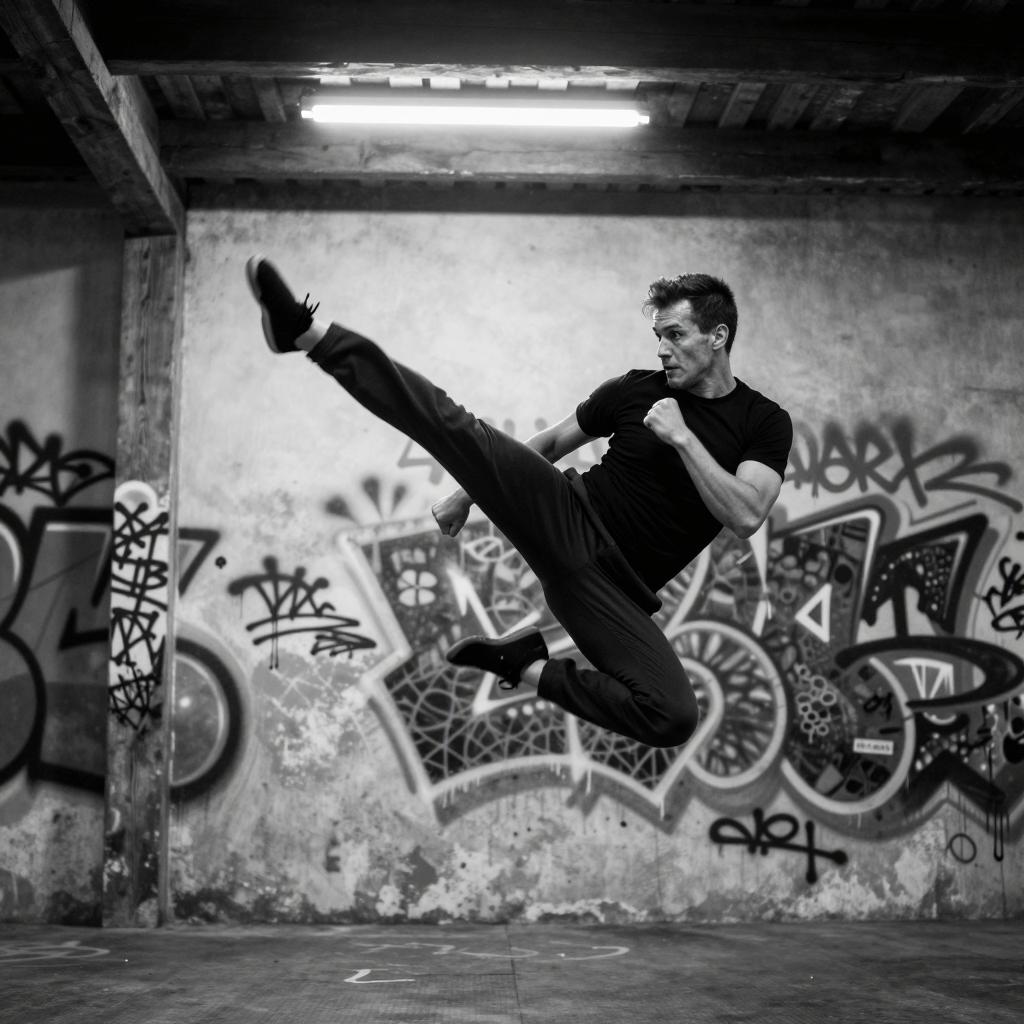 A male dancer in mid-leap. He wears a dark shirt, pants, and sneakers. His right leg is extended high while his left leg is bent. He is illuminated by a bright overhead light. The background is a dark, graffiti-covered wall with a stack of boards on the left.