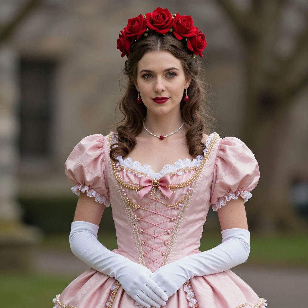 Victorian Fancy Dress, woman in a pink dress with a red rose crown and white gloves