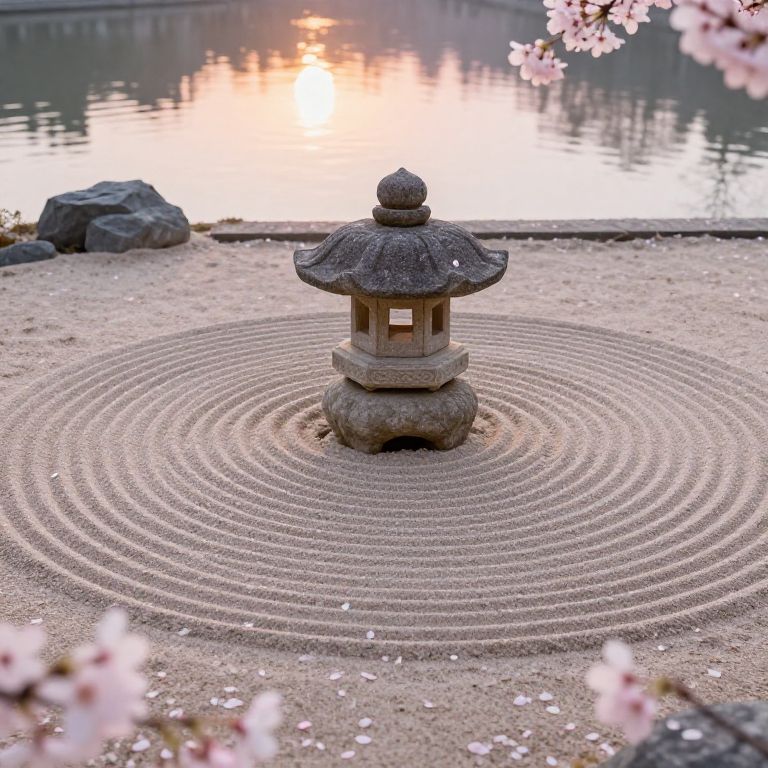 Centre of a peaceful Zen garden at dawn, meticulously raked sand patterns surrounding a large stone lantern, cherry blossom petals scattered on the ground, soft pastel colors, tranquil water reflecting the sunrise, minimalist and harmonious composition