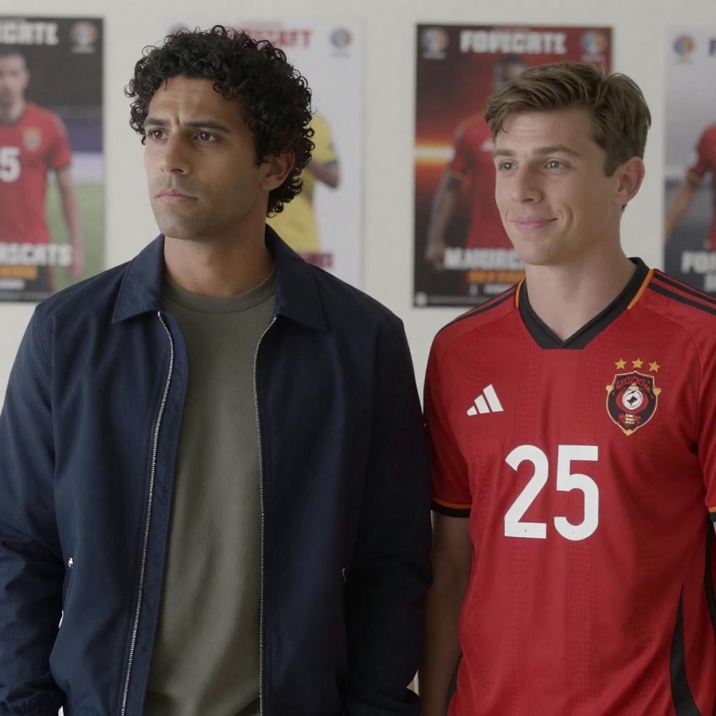 Photograph of two men. One with dark curly hair, serious expression, wearing a dark blue jacket with green shirt underneath. The other with light brown hair, slight smile, wearing a red soccer jersey with number 25. Background has posters. Both men stand side by side, facing slightly different directions.