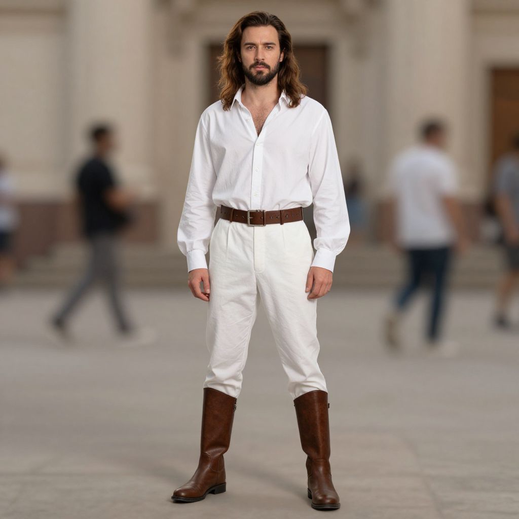 Prince constantine costume, male focus, boots, facial hair, 1boy, solo focus, beard, belt, shirt, blurry, full body, blurry background, brown hair, looking at viewer, standing, brown footwear, white shirt, long hair, pants