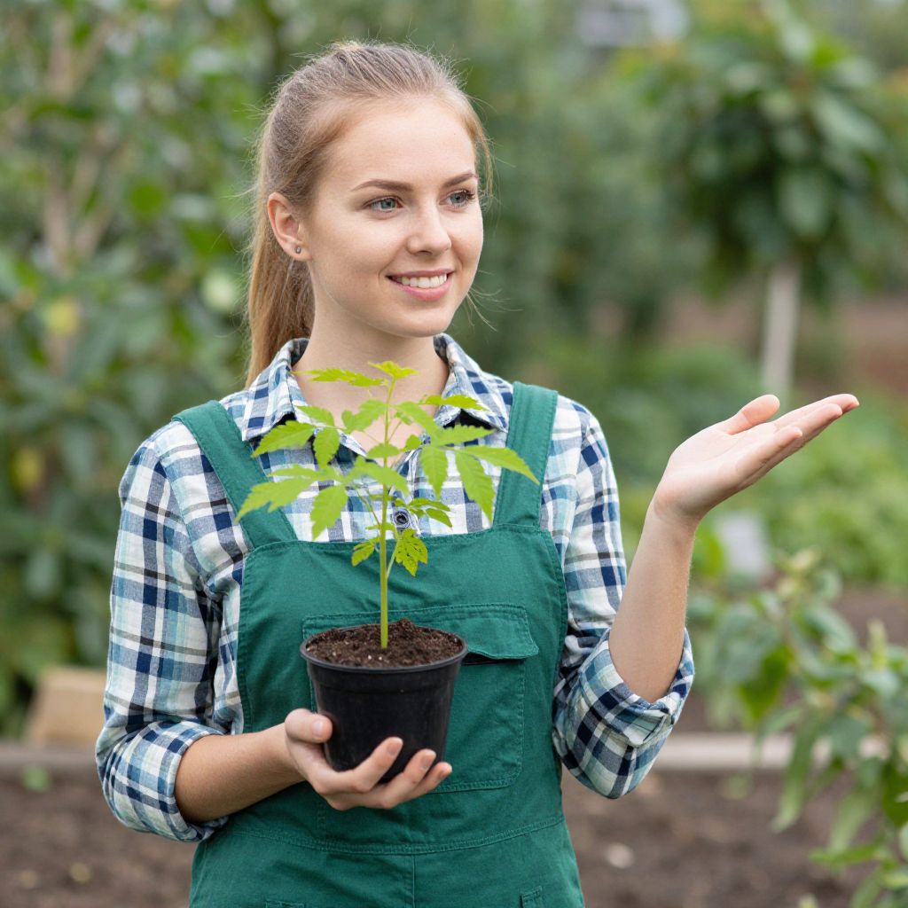 Blonde-haired woman standing outdoors in a lush green garden, wearing a checkered shirt and green overalls, holding a small black pot containing a vibrant young plant with delicate green leaves, while smiling warmly and gesturing towards the right as if explaining the process of potting on or planting out young plants.