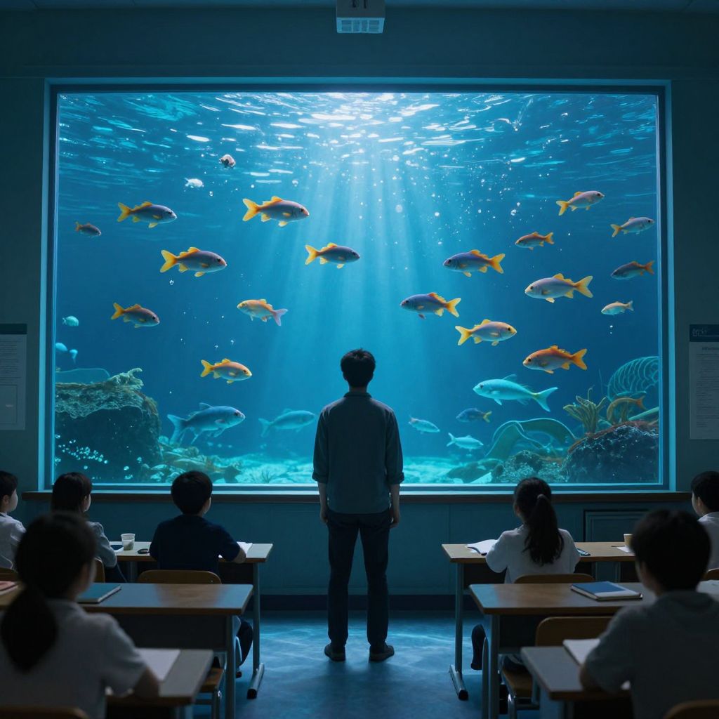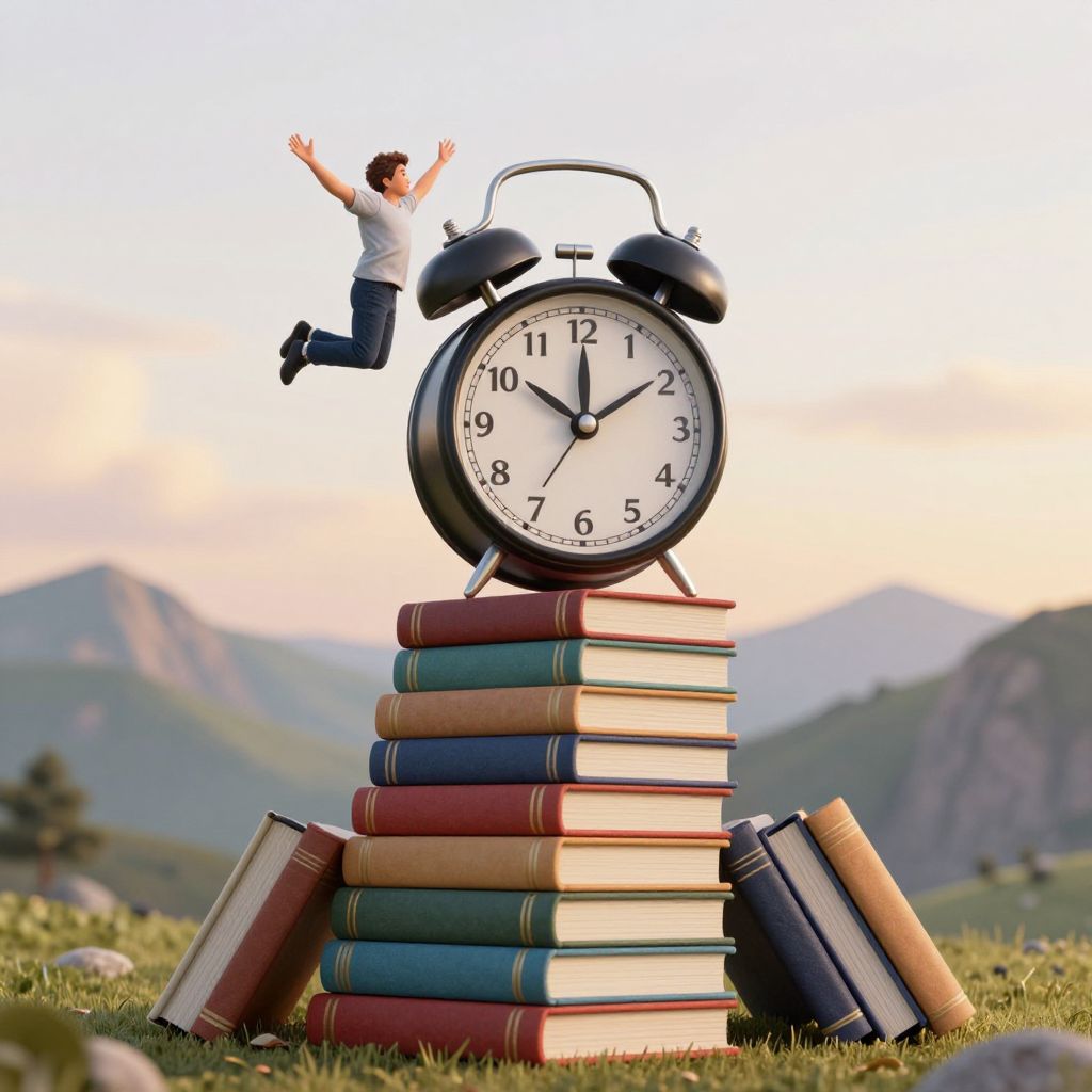 A surreal scene depicts a giant vintage alarm clock floating above a street lined with rows of students seated at desks, while a man in a business suit defies gravity by leaping toward the clock, symbolizing the inversion of conventional norms in an educational setting.
